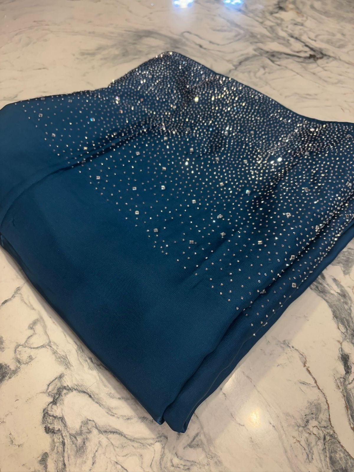 Dive into timeless elegance with the Ocean Luxe Saree, a stunning creation inspired by the serene depths of the sea. Drenched in a rich teal hue and adorned with delicate shimmer accents, this saree captures light with every graceful movement.